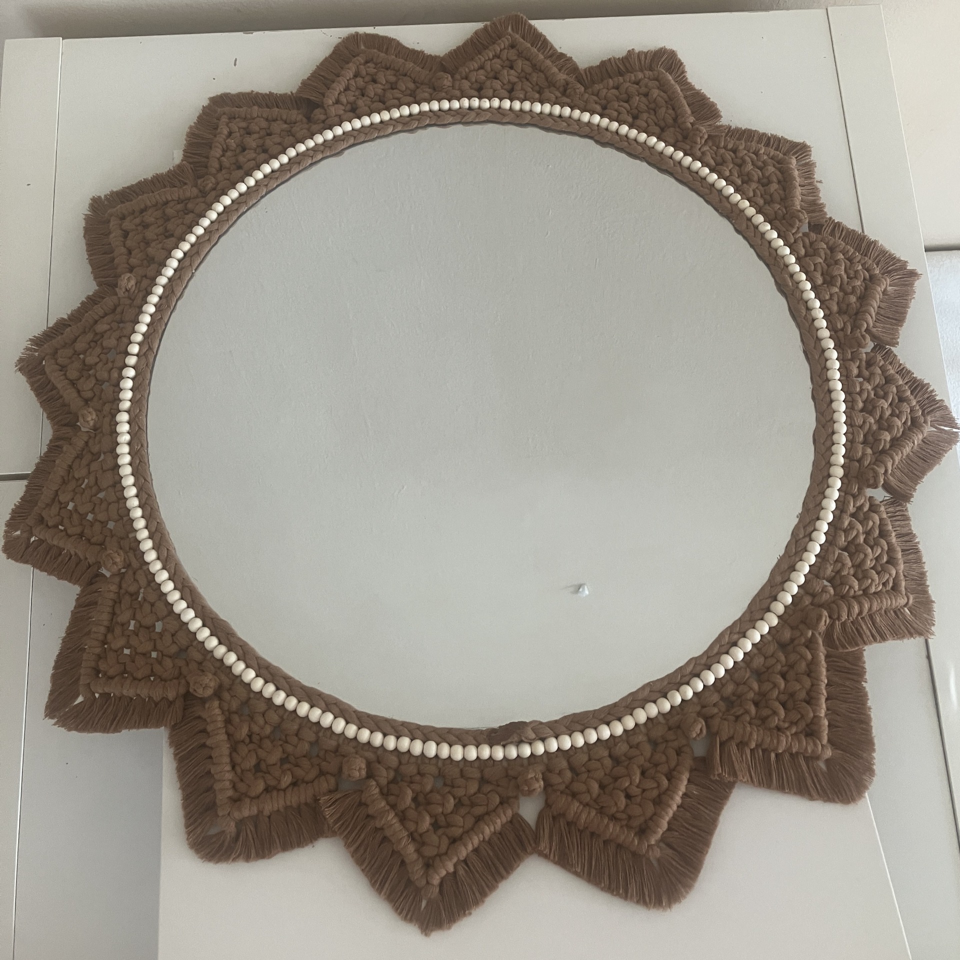 Významné macramé zrcadlo v karamelovém tónu s plastickou strukrůrou a paprskovitým tvarem, které se stává dominantním prvkem interiéru. Propojuje funkčnost s detailní ruční prací a přináší do prostoru teplo, světlo a harmonii.