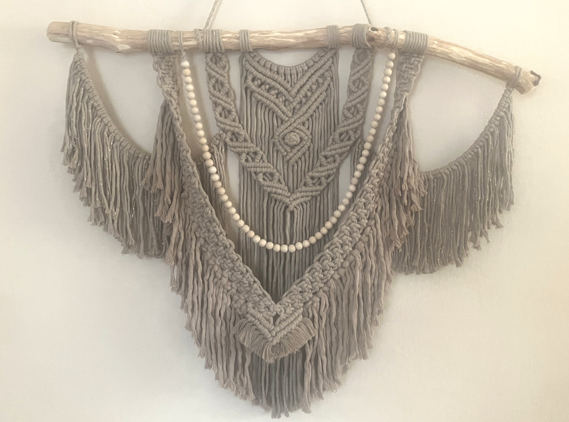 Dekoraci doplňují dřevěné korálky a přírodní větev, které podtrhují její organický vzhled. Macramé krásně vynikne v obývacím pokoji, ložnici nebo v prostoru určeném k odpočinku.